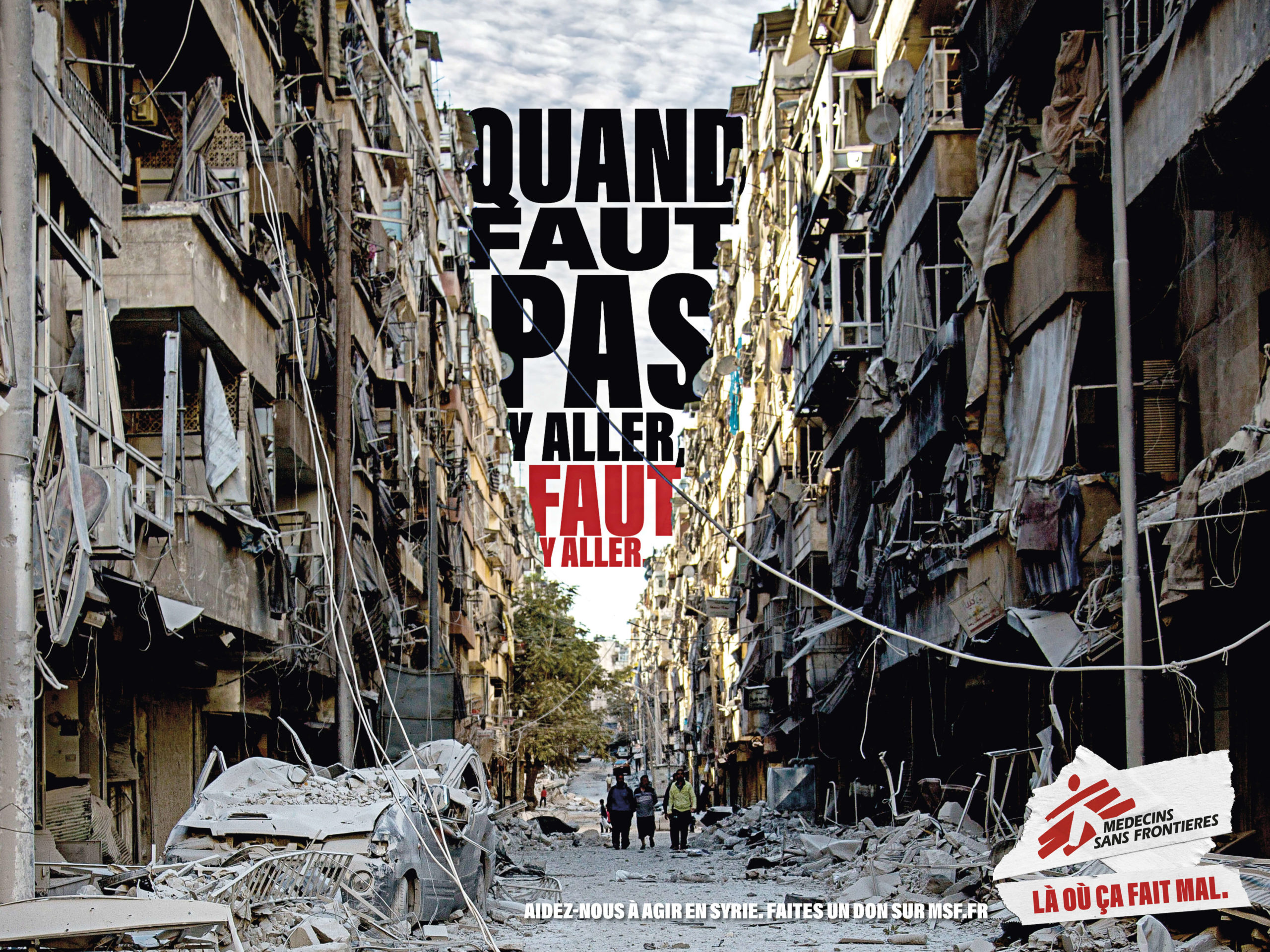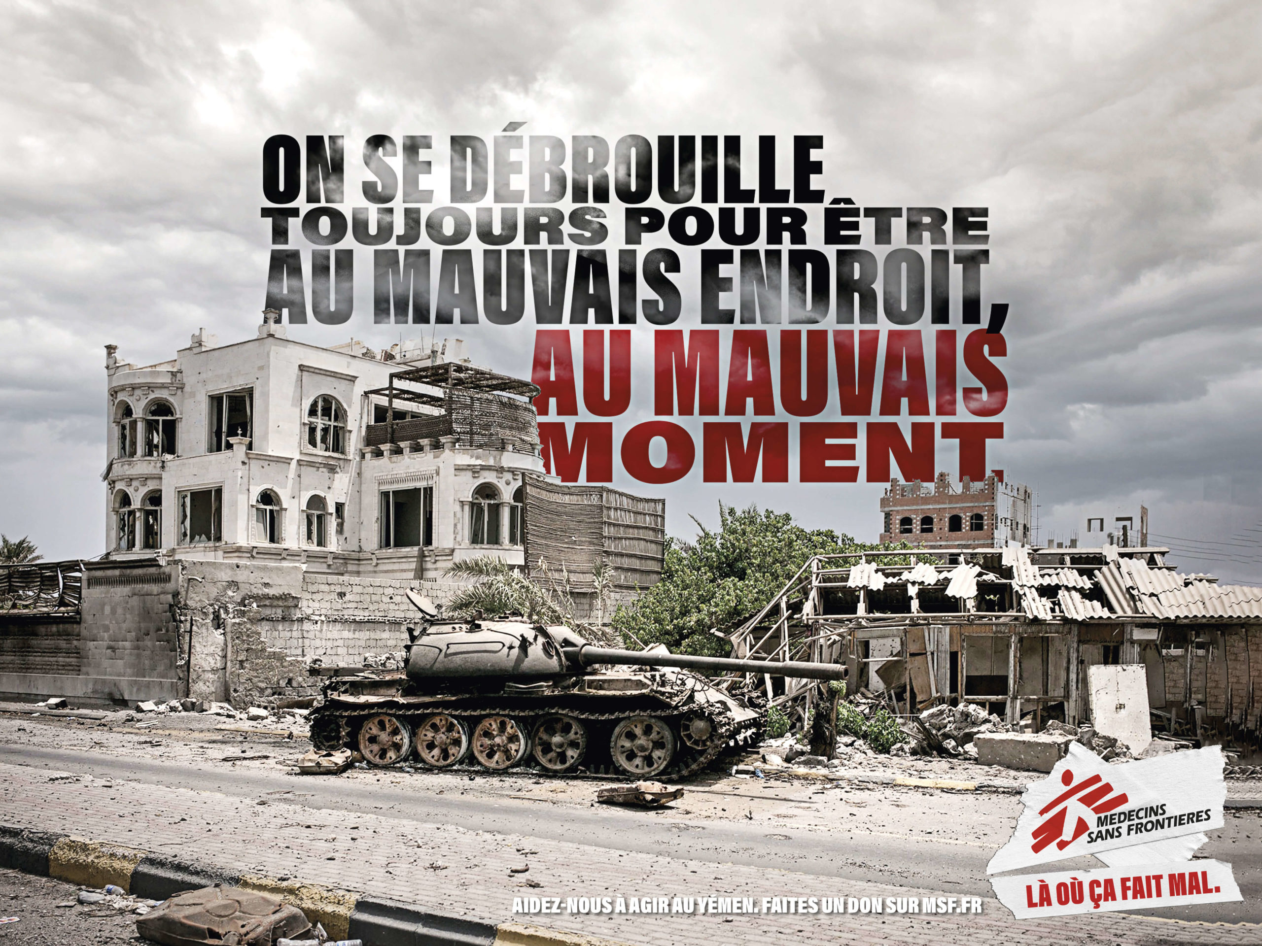 Cette mission est exprimée sous la forme d’une formule choc : « Médecins Sans Frontières. Là où ça fait mal ». Elle fait autant écho à la mission de MSF (soulager la douleur partout dans le monde) qu’au besoin de maintenir nos consciences en éveil et de rester tous sensibles à la douleur des autres, où qu’ils soient dans le monde.